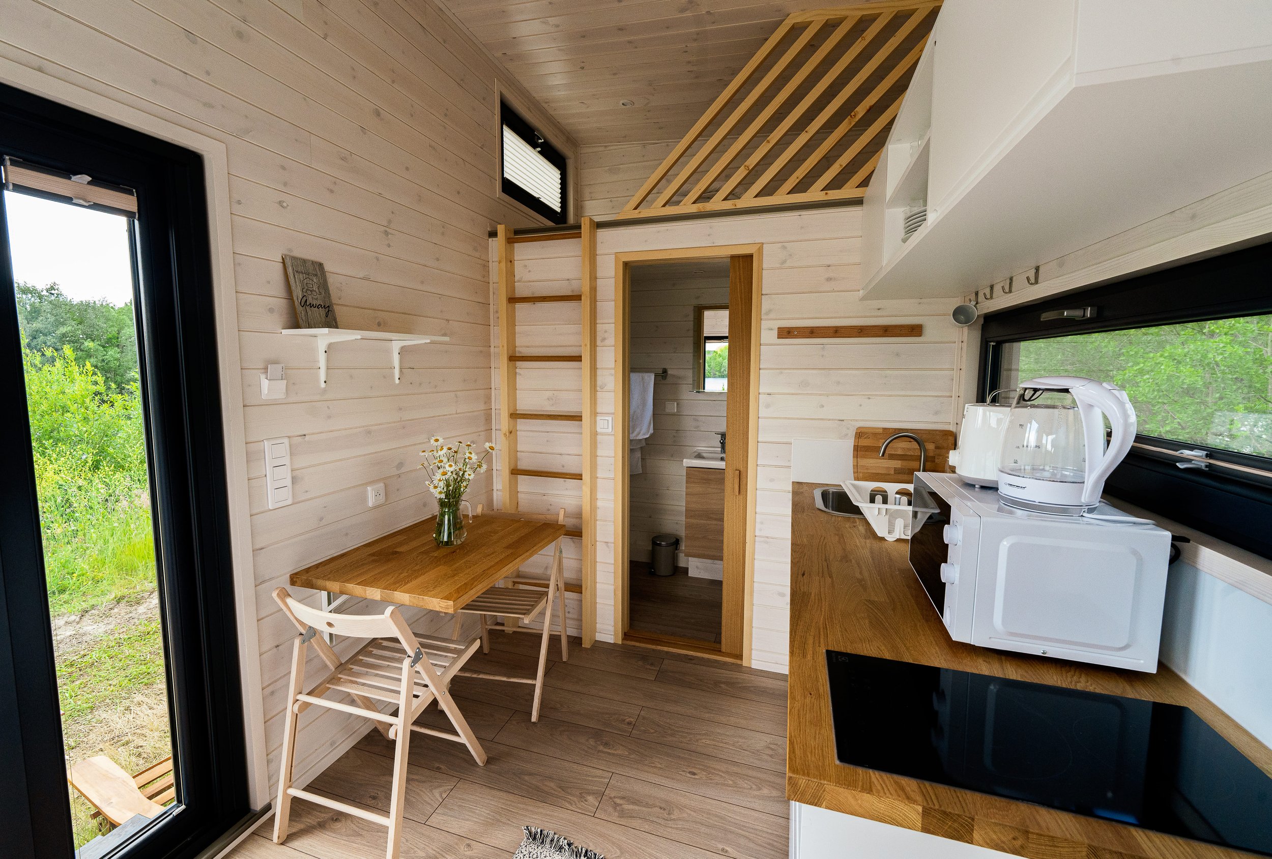 Installées au bord de lacs paisibles, nos tiny houses offrent un mélange parfait de confort et d’immersion nature. Chaque logement, soigneusement aménagé, dispose d’un coin nuit cosy, d’un espace repas fonctionnel et d’une terrasse privée avec vue directe sur l’eau, idéal pour admirer le lever du soleil ou prolonger la soirée au bord du lac.